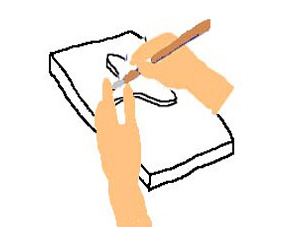 板に切り抜いた鳥を貼り、大まかに刀で削ります。